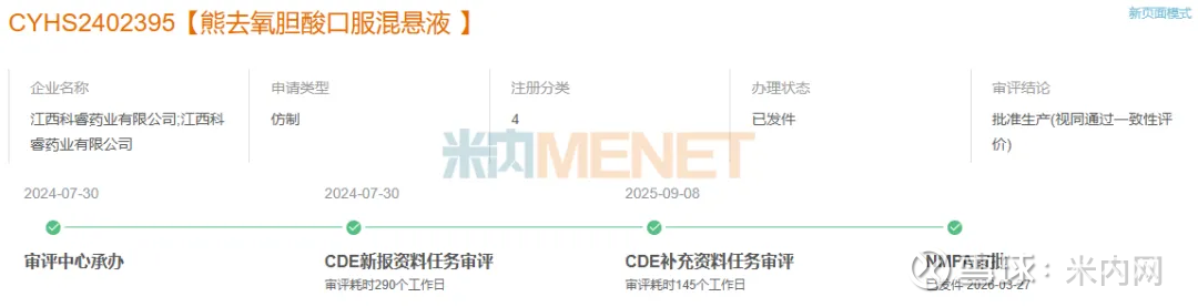 熊去氧胆酸是胆结石和胆汁淤积性肝硬化等疾病的常用药,米内网数据显示,目前该品种已有熊去氧胆酸片、熊去氧胆酸软胶囊、熊去氧胆酸胶囊、熊去氧胆酸口服混悬液获批上市。