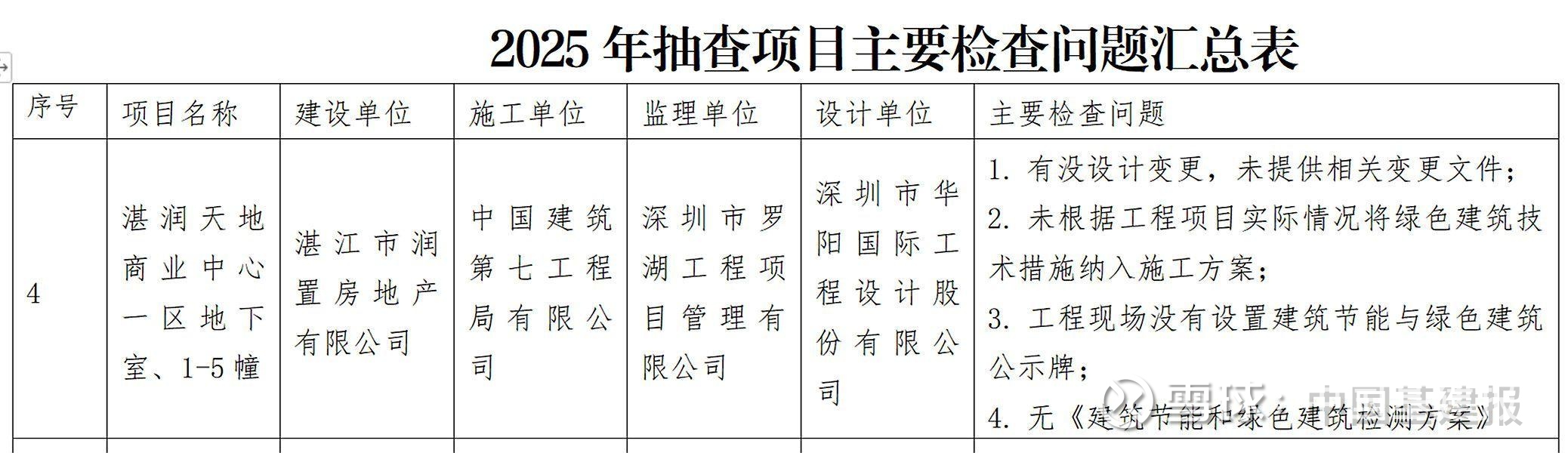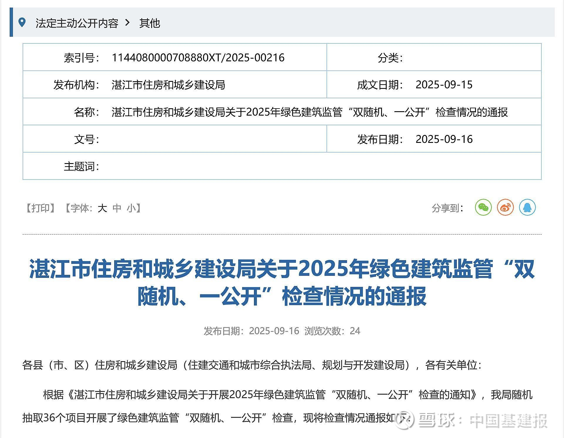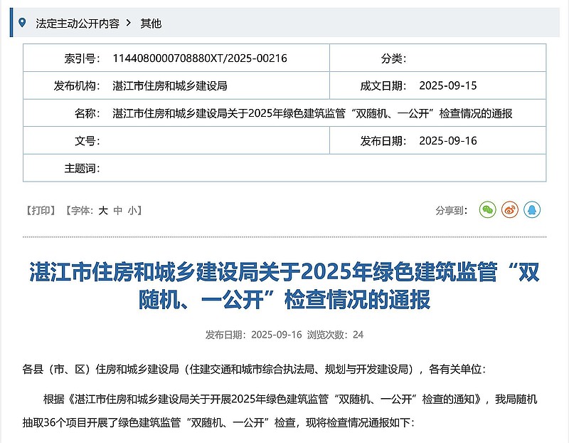 根据《湛江市住房和城乡建设局关于开展2025年绿色建筑监管“双随机、一公开”检查的通知》,近日,湛江市住房和城乡建设局随机抽取36个项目开展了绿色建筑监管“双随机、一公开”检查,并于近日发布了检查情况通报。