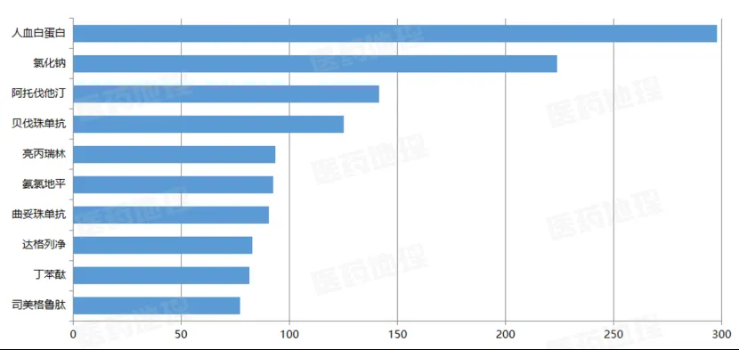 在刚刚过去的2025年,人血白蛋白更是以绝对优势领跑全品类。按通用名统计,其国内药物销售金额位列第一,呈现出断崖式领先的格局——领先排名第二的氯化钠约75亿元。阿托伐他汀与贝伐珠单抗紧随其后,年度销售额均突破100亿元大关。这一数据不仅印证了人血白蛋白在国内临床应用中不可撼动的刚需地位,也为新进入的玩家增加了市场的确定性与突围的挑战性。