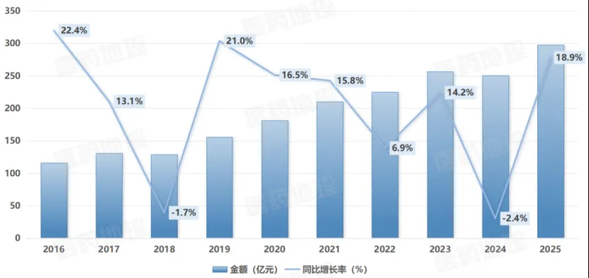 PDB药物综合数据库显示,过去十年间,人血白蛋白国内销售金额从2016年的100亿元左右波动上升至2025年的接近300亿元,市场规模持续扩大,增长势头稳健。