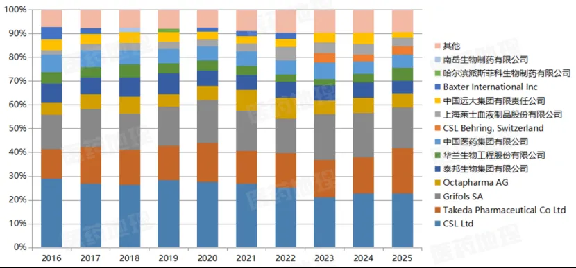 排名第二的武田制药(Takeda)市场份额约20%,公司在重组蛋白药物领域具备深厚积累,尤其在凝血因子VIII和血友病药物方面,占全球市场份额的30%。通过持续的并购整合,武田在血浆业务领域的产能与技术优势显著。与之不相上下的基立福(Grifols)总部位于西班牙,白蛋白和α-1-抗胰蛋白酶是其核心产品,公司通过在美国建立大规模血浆采集网络,有效保障原料供应。