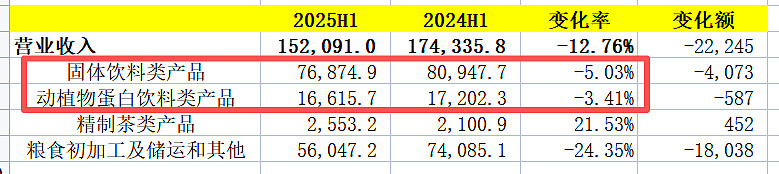 最大的问题是核心主业是个缩量的业务,这就比较麻烦。固体饮料类产品收入同比-5%,动植物蛋白饮料类产品收入同比-3.4%。