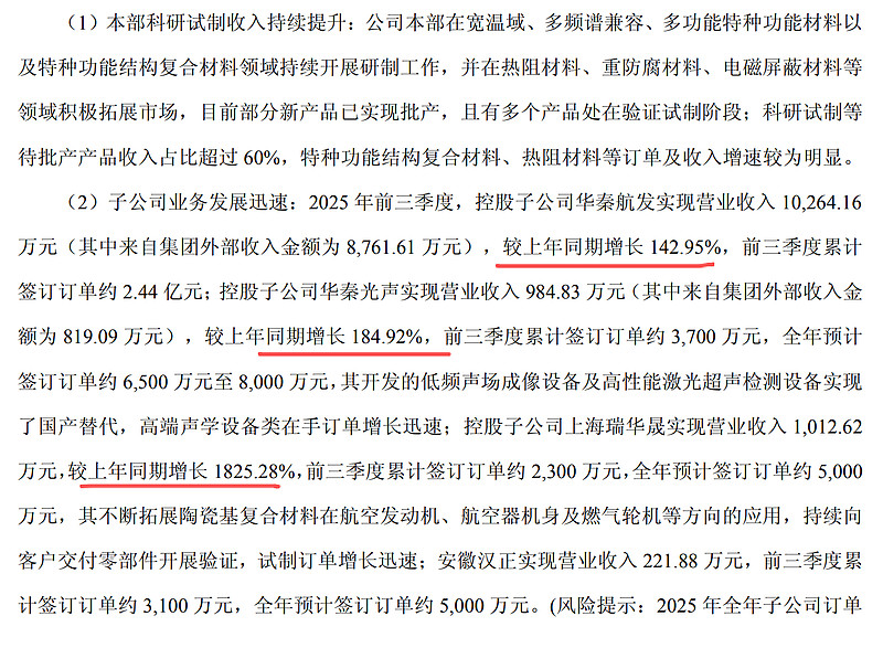 收入增加约6300万,主要增长贡献来源是布局的几个子公司,包括华秦航发、上海瑞华晟和华秦光声,本部的隐身材料板块大概率经营情况不佳,