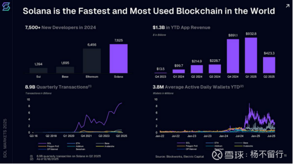 交易与流动性优势显著:2025年二季度Solana完成89亿笔交易,使其成为全球流动性最强、活跃度最高的数字资产生态之一;年内平均活跃钱包数量380万,进一步巩固了其生态黏性。