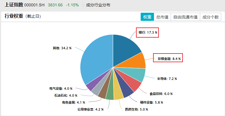 2、银行股占上证指数的权重最大。