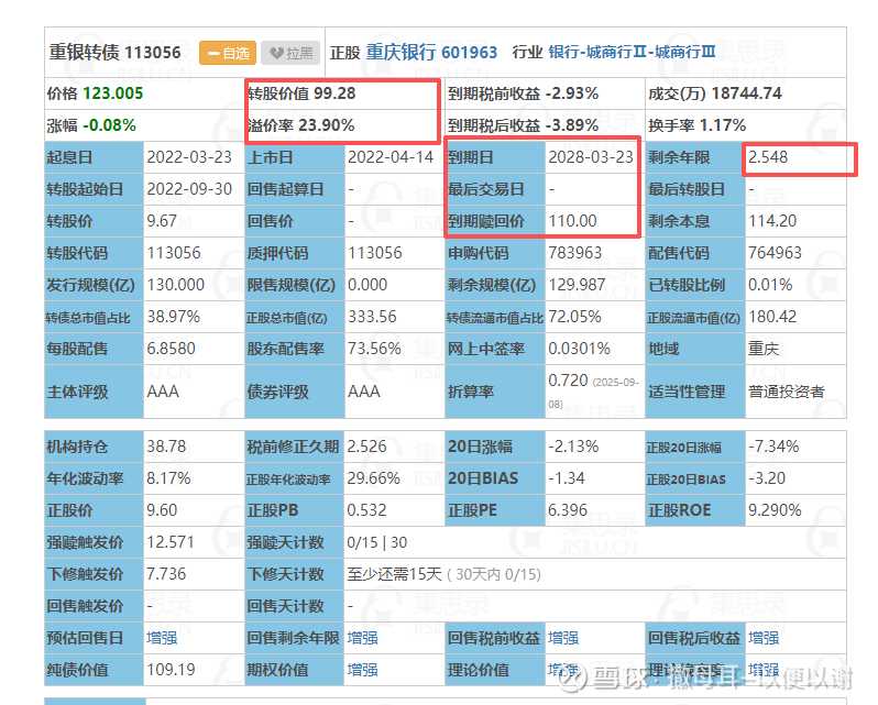 4.重庆银行601963 可转债还有2.5年到期,溢价率 24%,近2个月股份银行几乎都调了20%,重庆银行亦没少跌有22%,中报收入增长7%,利润增长5%,ROE 11.5%/全年,股息有4.3%. 重庆业绩在其中是非常出色的,有望跑出黑马!