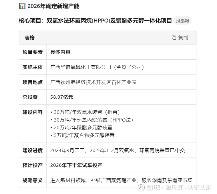 A. **广西华谊氯碱三期项目**:计划2025年6月建成投产,包括25万吨/年双氧水装置、30万吨/年环氧丙烷装置、20万吨/年聚醚多元醇装置和5万吨/年聚合物多元醇装置[^48^]