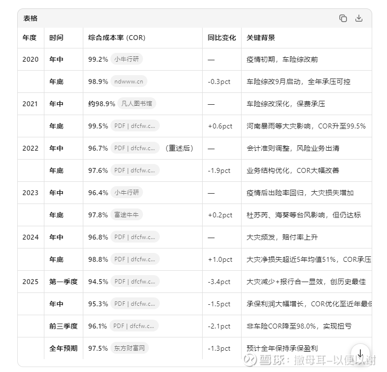 2. 对财险最观点的是,综合成本率,以下是其2020-2025年年中(半年报)和年底(年报)的综合成本率(COR)数据整理: