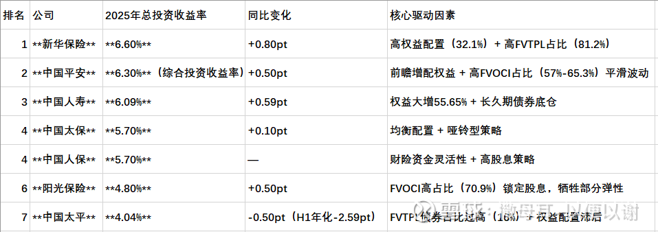 4. 新华保险以6.60%的总投资收益率创近年新高,其32.1%的权益类资产占比和81.2%的FVTPL股票占比在六家公司中均为最高,使其在2025年权益市场结构性行情中充分释放了收益弹性.