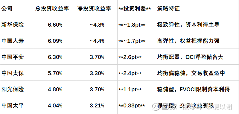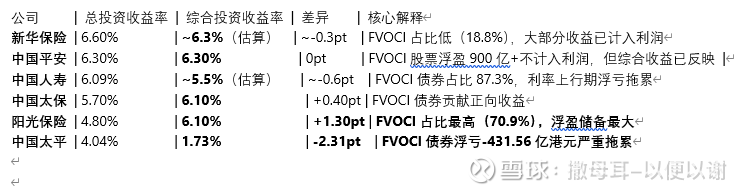关键洞察:投资利差的大小与FVTPL占比高度正相关。新华保险、中国人寿1.7-1.8pt的利差,源于其77%-81%的FVTPL占比下,权益市场上涨带来的公允价值变动直接计入损益。阳光保险1.1pt的最小利差,则因其70.9%的FVOCI占比将大量浮盈"锁"在净资产中,利润表仅反映股息收入。