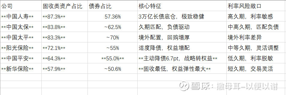 关键趋势:"减债增股"成为行业共识。中国平安债券占比同比下降6.7个百分点,释放资金用于权益配置;新华保险固收占比57.9%为六家最低,为32.1%的权益配置留出空间;