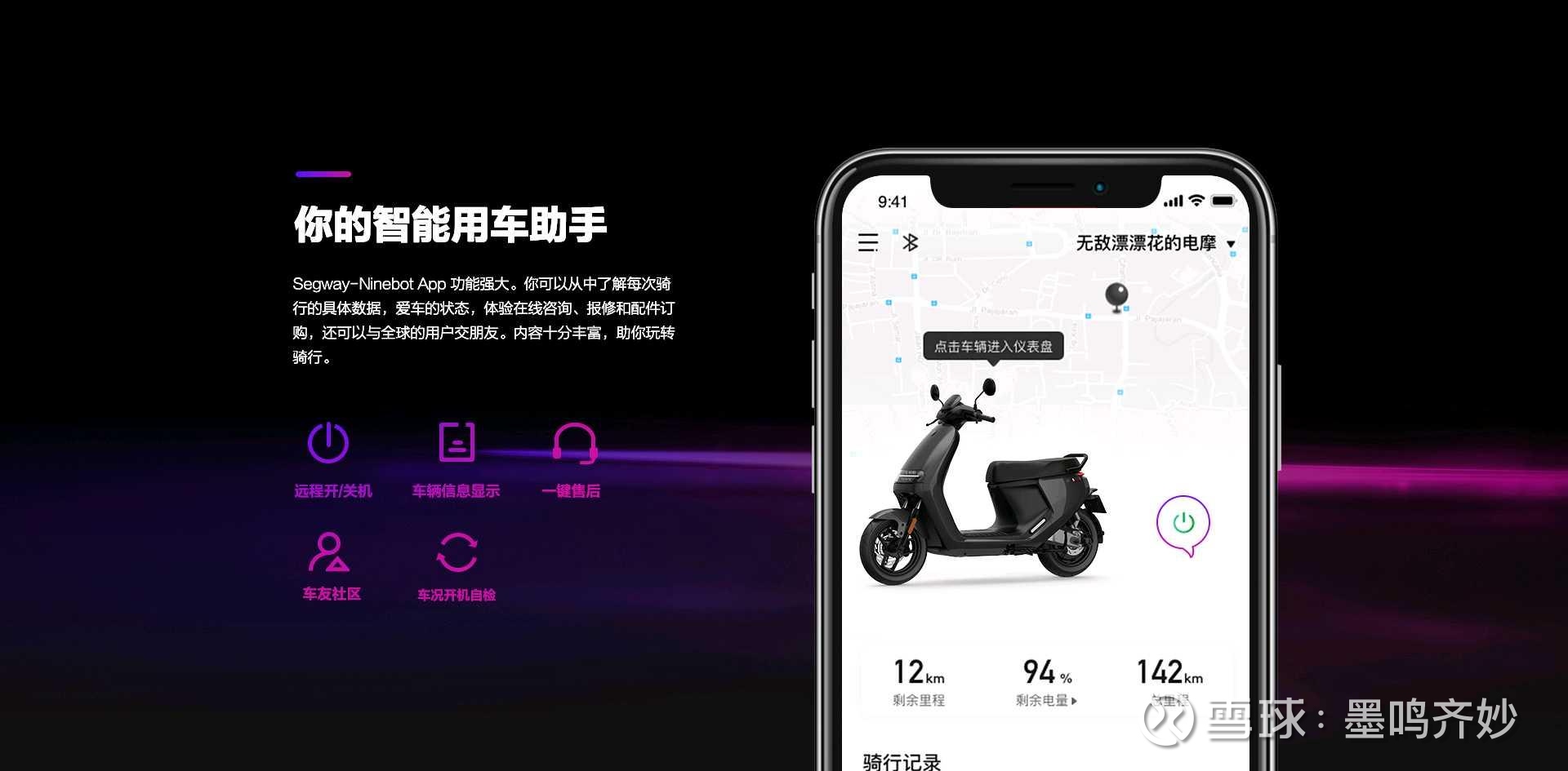 同时由于九号电车有云盒功能,能在APP中提供精准的轨迹和定位。因此也有不少家长愿意给孩子配置便于管理孩子的日常出行。同时,很重要的一点,9号的智能管理车机助手66元/年,提供诸如车辆定位。手表解锁,NFC、手机解锁等时尚智能化功能。客户一旦成为九号的客户并上手该系统,几乎就很难离开该系统,粘性非常很高,售后服务(提供6S服务超预期,同时类似4S店,外面没法直接修理会报错)、加系统黏性形成消费闭环。