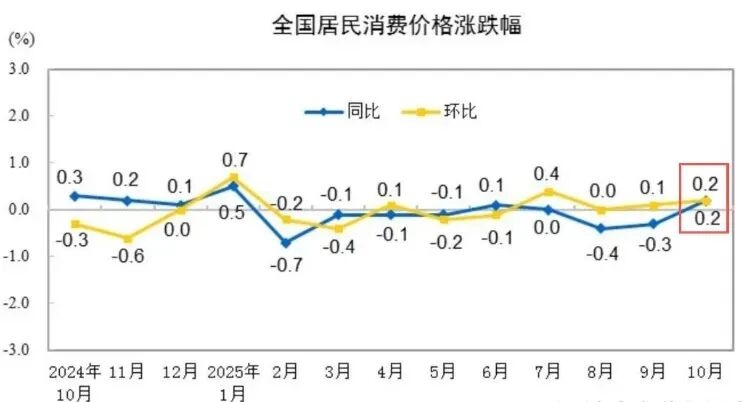 国家统计局公布,10月份CPI环比上涨0.2%,同比由上月下降0.3%转为上涨0.2%。扣除食品和能源价格的核心CPI同比上涨1.2%,涨幅连续第6个月扩大,为2024年3月以来最高。国庆、中秋双节叠加,宾馆住宿、飞机票和旅游价格分别上涨8.6%、4.5%和2.5%;食品价格涨幅高于季节性;工业消费品价格稳中有涨。