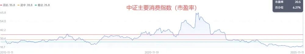 接着再看估值高低。目前中证消费指数的市盈率是20.5倍PE-TTM,低于2019年消费大牛市启动前的约22倍PE。从十年的维度看,目前的估值水平已经比过去十年里90%以上时间都要低。就估值水平来说,中证消费确实处于历史底部区间。