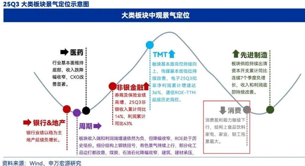从机构给出的行业景气度定位看,消费正处于景气度下行的末端。从业绩看,消费行业的三季报分化比较厉害,白酒、旅游等板块还在深度调整,白酒三季度去库存动作显著加快;零食、调味品等细分逆势增长。整体来说,消费行业的基本面整体上处于底部,其中三季度处于加速释放压力的状态。