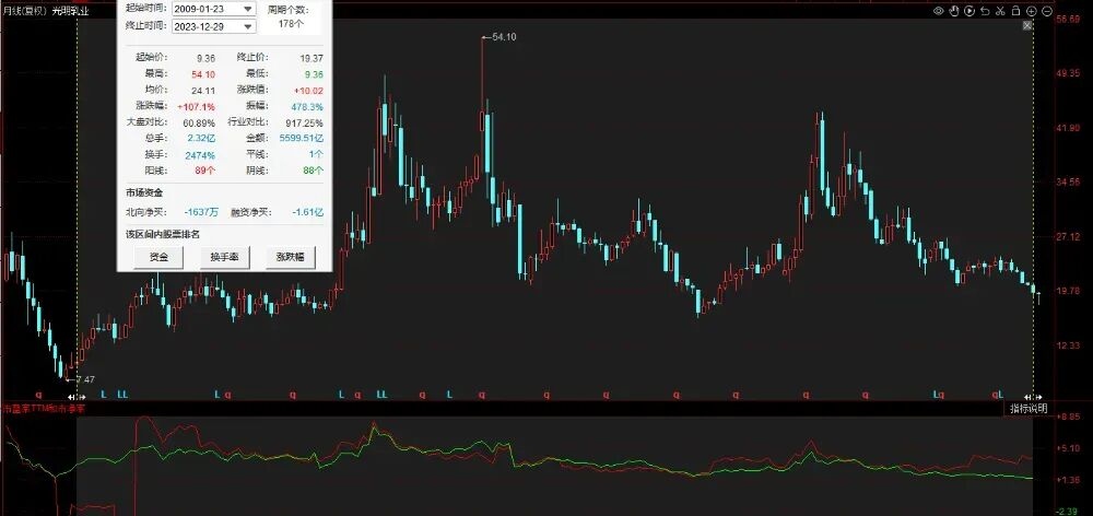 从2009年到2023年,光明乳业股价上涨了105%,最大涨幅为478%。