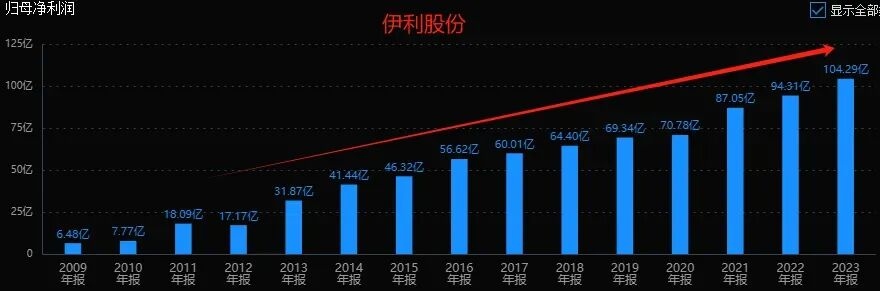 看下利润端,伊利的历史业绩是持续增长的,2009年利润6.5亿,2022年94亿,利润增长超过14倍。