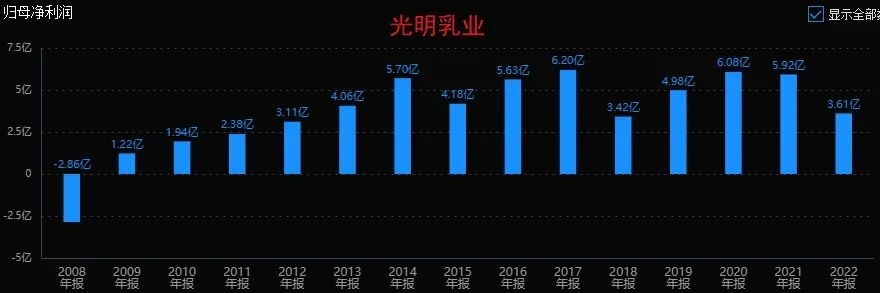 光明2009年利润1.22亿,2022年3.6亿,利润增长不到3倍。光明从2014年之后业绩一直起伏不定,2014年还有5.7亿,2022年只剩3.6亿,业绩下降近4成。如果你不幸在2014年买入,然后持有到至2023年,十年期间,股价不涨还下跌了53%。