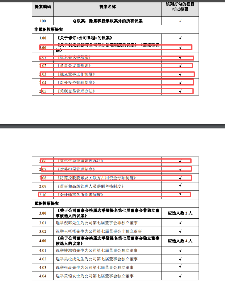 划红色的是被否决的,其余是被投了赞成票了,因为股权及其分散,没有实际控制人,这兴致勃勃赶来投票的700多万票,就为了给修改公司章程和原来在市场上被骂得狗血淋头的管理层顺利换届投赞成票,然后其他齐刷刷投了反对票。
