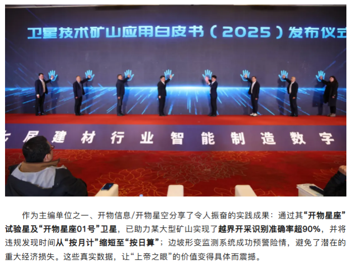 这本备受瞩目的白皮书,由建筑材料工业信息中心、空天信息大学前沿技术产业创新研究院、开物信息/开物星空等近二十家单位共同打造。它不仅仅是一本技术报告,更是驱动矿业“降本增效”的实战指南。白皮书首次系统性地揭示:如何利用卫星遥感、北斗导航、天通通信等“太空科技”,破解矿山“监管难、安全险、效率低、绿色差”的四大痛点,让矿山管理从“在地面摸索”跃升至“在星际掌控”