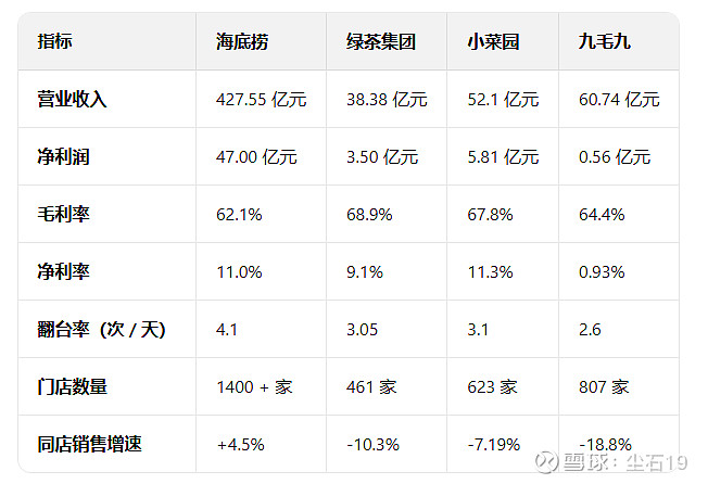 以下是海底捞、绿茶集团、小菜园、九毛九四家港股上市餐饮企业的经营模式、竞争优势及财务数据对比分析:
