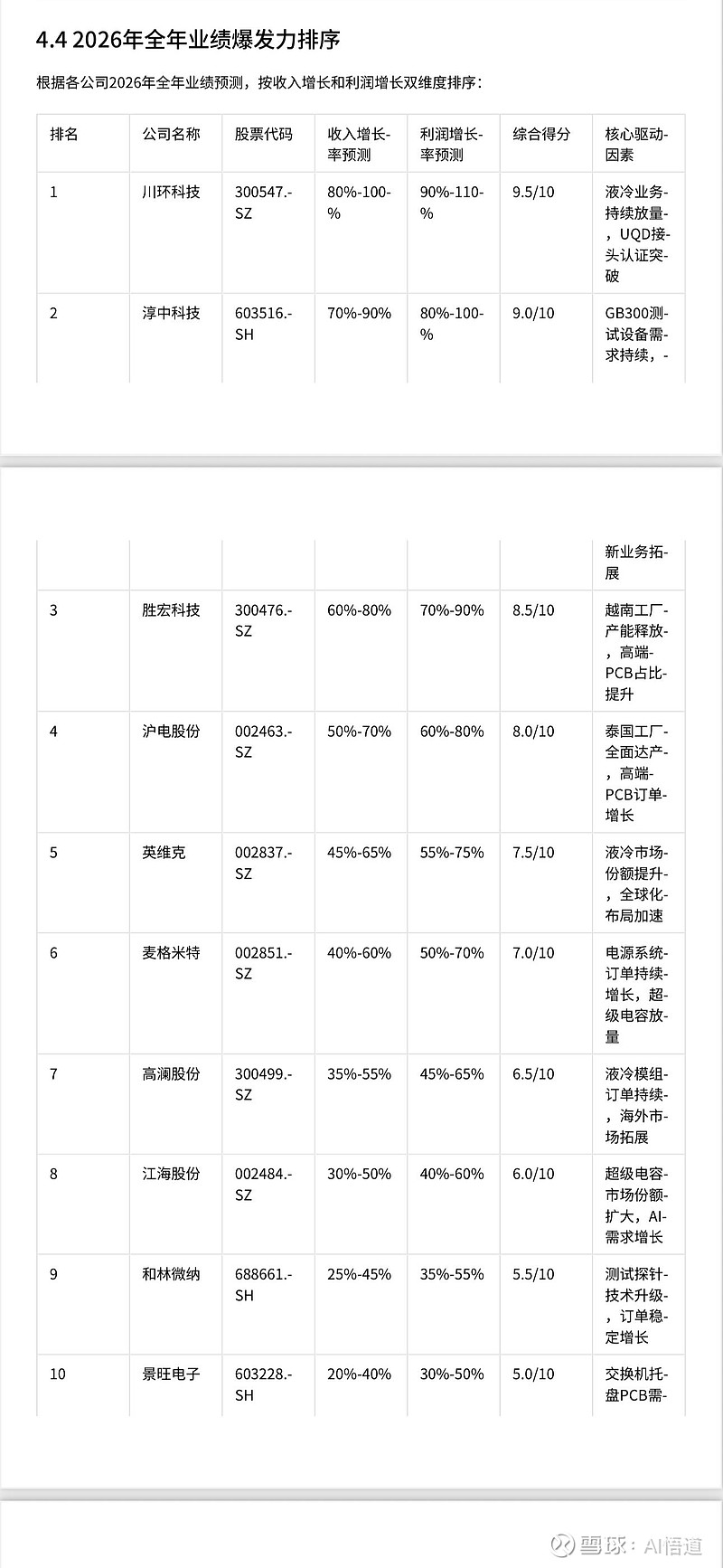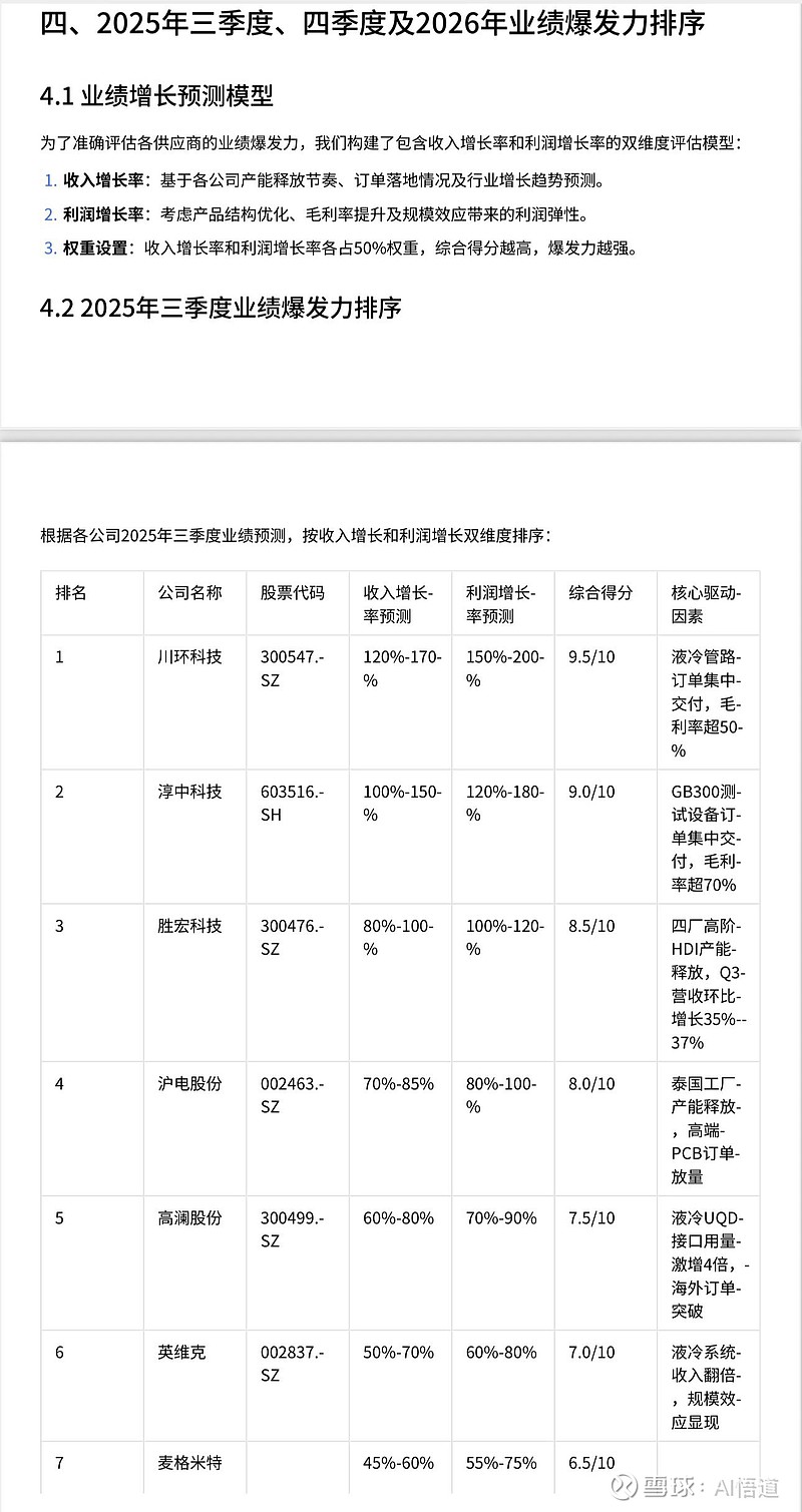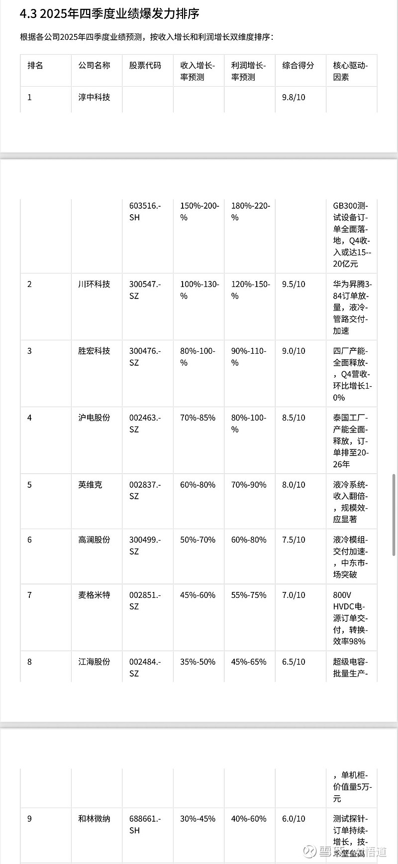 3. 业绩爆发力排序 :按2025年第三季度至2026年的收入与利润增长潜力排序,川环科技、淳中科技、胜宏科技位列前三,2025年净利润增速均有望超过100%。