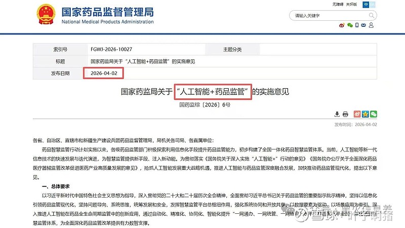 $东软集团(SH600718)$ 国家药监局,人工智能加药品监管第一梯队(最直接):东软集团(已与药监局合作)、卫宁健康(智慧药监系统建设),直接承接政策落地的项目需求;2. 第二梯队(行业升级):药明康德、凯莱英等CXO/AI制药企业,政策加速AI药物研发的合规化,提升审评效率,打开行业成长空间;