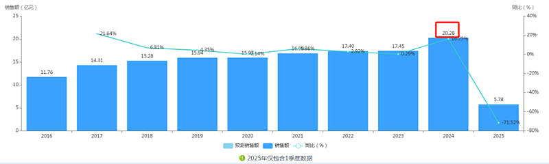 企业最高年销售额20.28亿元。从企业年销售额来看,2016年—2025年一季度,奇正藏药的国内公立医疗机构销售额总计151.06亿元,年销售额均超过11亿元,保持8年连续正增长,最高销售额年份2024年20.28亿元。