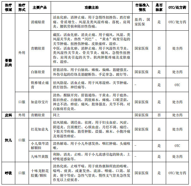 目前,其拥有以消痛贴膏、白脉软膏等25个独家品种为核心的141个药品批准文号,其中OTC品种60个,国家秘密技术(秘密级)品种3个,产品广泛覆盖骨骼肌肉系统、神经系统、呼吸系统、消化系统、泌尿系统以及心脑血管、妇科、儿科、皮肤科等领域。