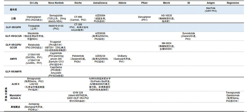 此外,面对这一市场蓝海,MNC纷纷加快研发和战略布局,积极推进下一代减重产品的开发。礼来正在推进小分子口服GLP-1药物Orforglipron及三靶点激动剂Retatrutide的关键临床研究;诺和诺德则通过引进联邦制药的三靶激动剂UBT251,并推进GLP-1/胰淀素复方制剂CagriSema的临床开发,进一步巩固其产品矩阵。此外,罗氏、安进、默沙东、阿斯利康等企业也通过收购、合作引进或自研方式积极切入该赛道。