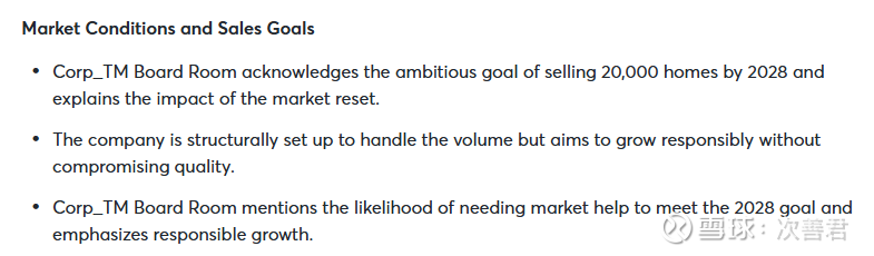 财务影响: 100个基点 (bps) 的利率买断会导致毛利率 (GPM) 和营业利润率 (OPM) 下降 350-400个基点 。战略考量:Lennar 选择了优先保证市场份额和销量,而非单纯追求利润率 。成本控制: 通过维持开工量,确保持续分包给供应商,从而获得更低的成本结构(比同行低10%),利用过去几年的通缩效应回到疫情前的成本结构 。相比之下,Toll Brothers 曾解雇分包商,重启成本会很高 。财务目标: 目标是 17% 的利润率,3-4倍的资产周转率,最终实现 30-40% 的资本回报率 (ROIC) 。