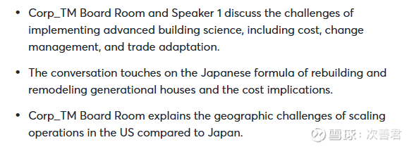 Sheryl对日本玩家的评论:第一,他们似乎完全没有整合品牌,比如MDC,完全没有整合。收购以后的所有品牌似乎都还是各自为政,没有把协同提取出来,包括Tri Pointe听到的消息也是让它自己跑。第二,日本玩家工厂先生产再运输到现场组装的办法在日本这样高密度的市场是可以玩转的,但是NVR也是这个办法,在美国就很难规模化,因为距离稍远,运输就变得非常昂贵。另外,要兴建工厂在美国拿Permit也很难。