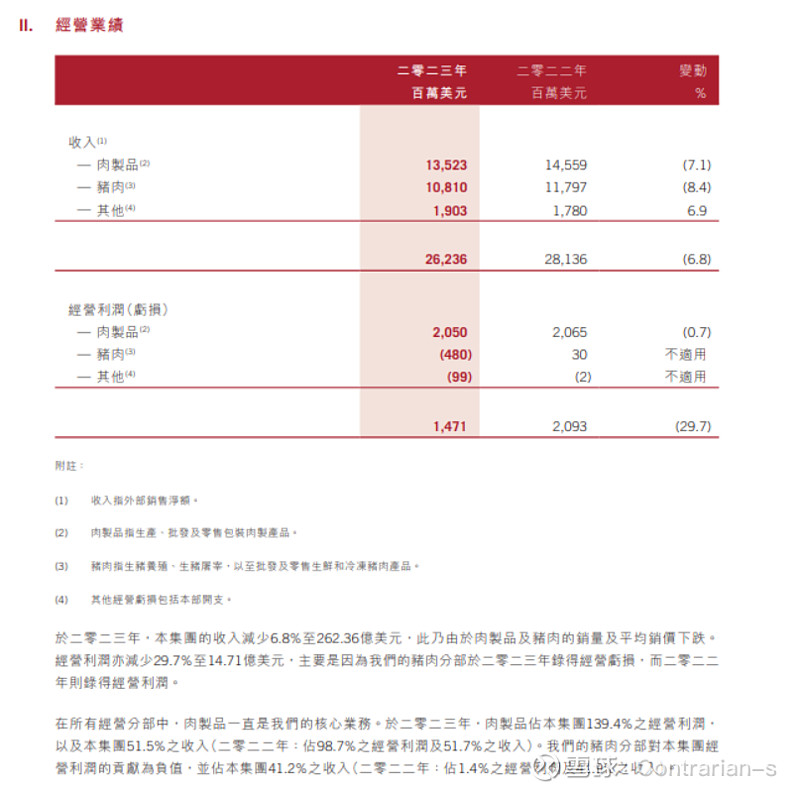 下面这是万洲国际的2023年年报节选,可以看到猪肉部分亏损严重。虽然这里是把生猪养殖和屠宰都放在了猪肉部分,其实主要亏钱的就是SFD的生猪养殖业务。