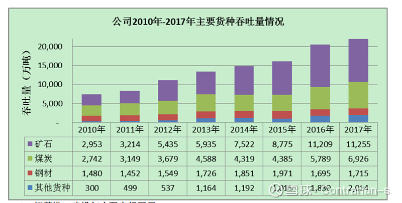 唐山港的经营模式以散杂货运输为主,而散杂货里面主要包括了矿石、钢铁和煤炭这三块。这和唐山港对应的客户区域密切关联:唐山的钢铁、山西、陕西和内蒙的煤炭;铁矿石则主要来自于海外进口,唐山港用于接卸货。精简的说就是:北煤南运、钢材输出、进口铁矿石接卸。