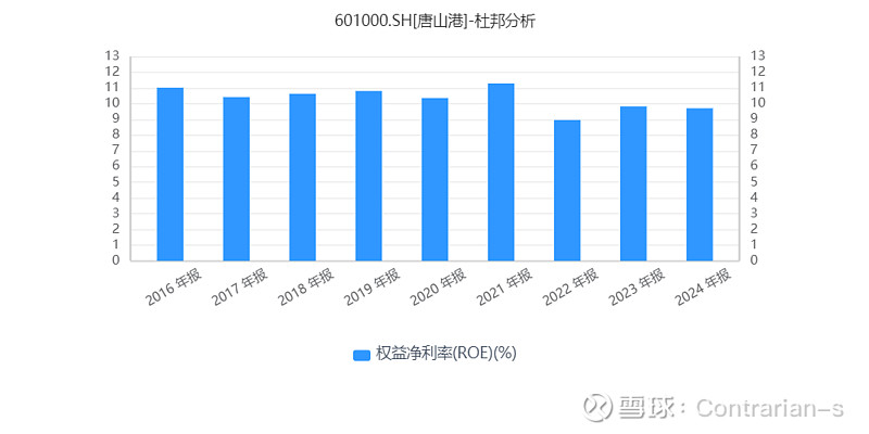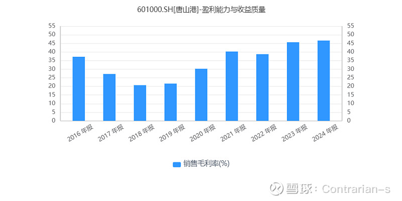 从ROE来看,唐山港的ROE基本维持在9%以上,在港口中绝对是属于高ROE。而且因为负债率极低,所以ROE和ROA相差不大,并且杠杆作用有限。所以唐山港的高ROE就是实实在在的来自于港口经营。毛利率随着聚焦散杂货运输的主业以及边缘业务的剥离不断抬升,近年来基本维持在45%以上;净利率保持在35%以上。