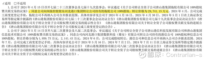 除了正确看待营收,还有一点也非常重要:唐山港一直在向实控股东转让资产,主要是与港口业务相关性不强的资产,或者说盈利能力不强的资产。