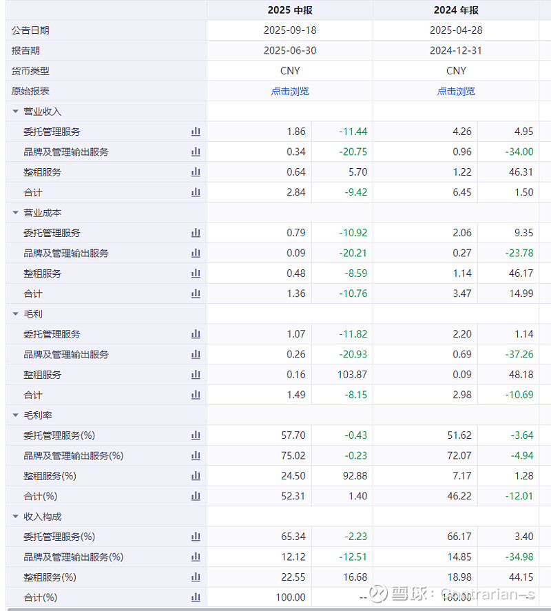 (1)部分委托管理服务项目已经解约:从2025H1的表现来看,委托管理服务的收入下滑明显,下降11%,主要是因为项目经营不善而解约影响营收。纵向来看,2025H1是公司委托管理服务业务首次出现营收下滑。虽然下半年公司又会有3个项目开业,有希望能够弥补部分上半年的委托管理服务营收下滑,但并不是一个好兆头。
