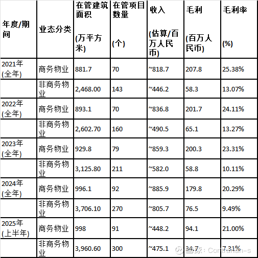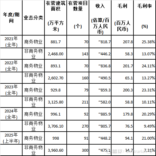公司的主要扩张是通过非商务物业实现的,尤其是在管项目数量从2021年的143个激增至2025年中期的300个,这反映了公司近年来积极通过投标和收并购(如置佳物业)来实现规模化发展的策略。