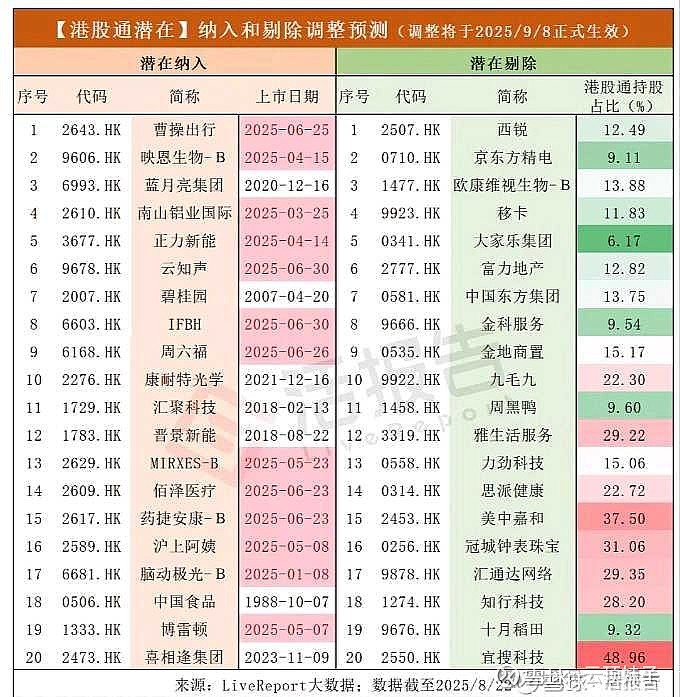 9月8日(周一)加入及退出港股通的港股名单加入20只:加入港股通后,内地投资者可以买入卖出股票。中国食品、博雷顿、汇聚科技、晋景新能、碧桂园、康耐特光学、喜相逢集团、沪上阿姨、佰泽医疗、南山铝业、药捷安康、MIRXES、曹操出行、正力新能、周六福、IFBH、脑动极光、蓝月亮集团、映恩生物、云知声退出20只:退出港股通后,内地投资者只能单向卖出股票,不能买入。冠城钟表珠宝、思派健康、大家乐集团、金地商置、力劲科技、中国东方集团、京东方精电、知行科技、周黑鸭、欧康维视生物、美中嘉和、西锐、富力地产、雅生活服务、宜搜科技、金科服务、十月稻田、汇通达网络、九毛九、移卡