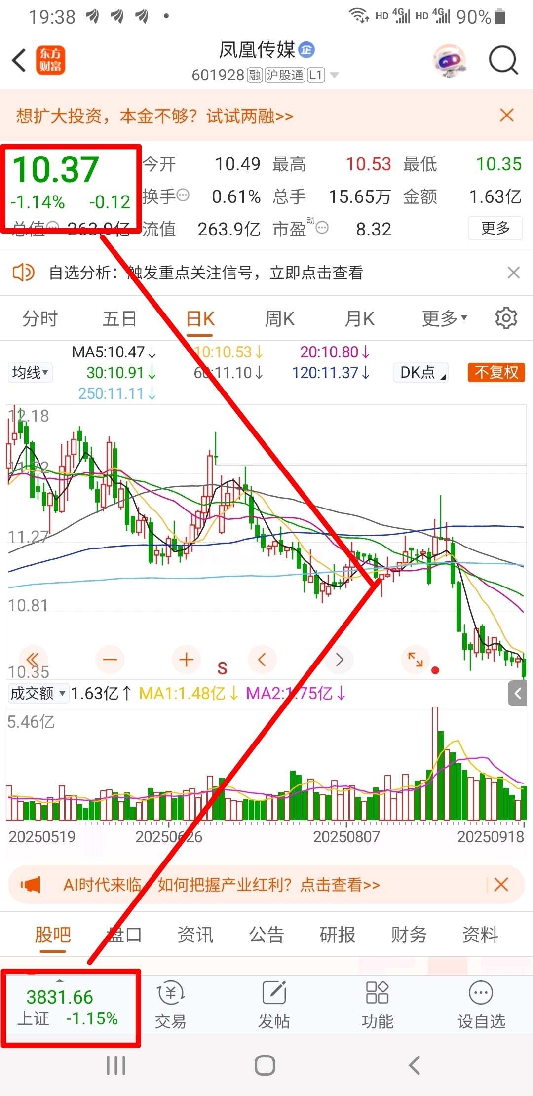 股吧里一片喊杀声,看空做空者不绝于耳。说来奇怪,9月18日凤凰传媒下跌1.14%,沪市大盘却下跌了1.15%,硬是没跌过大盘!说的那么不堪入耳,却有一种跌不动的感觉。也有人将凤凰传媒与长江传媒相提并论,这样相比是不妥的,长江传媒跌的惨,不能说明凤凰传媒就会一样惨,因为凤凰传媒是龙头啊,龙头肯定有不同凡响的特质,否则就不是龙头。你将长江传媒与凤凰传媒相提并论,或者喊杀声阵阵,只能说明一个问题,你的认知有很大的局限性。我这样说,你服吗?不服就拍马过来。