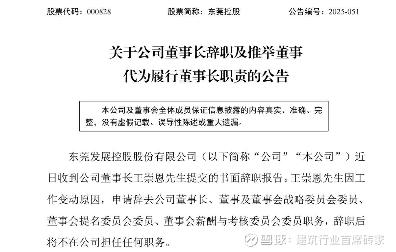 近日,东莞控股(000828.SZ)一纸公告打破资本市场平静。出生于1981年的董事长王崇恩因工作变动,正式辞去公司董事长、董事及董事会多专门委员会委员职务,辞职后将不再担任公司任何职务 。