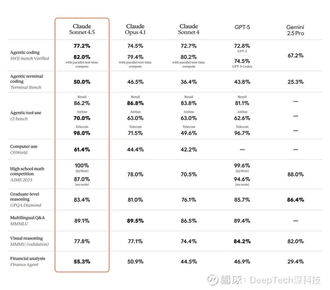 从纸面数据来看,Claude Sonnet 4.5 的表现确实亮眼。在 SWE-bench Verified 这个衡量真实软件工程能力的基准测试中,新模型拿到了 77.2% 的分数。如果采用并行测试时计算(parallel test-time compute)——也就是同时运行多个尝试,然后筛选出最佳结果——这个数字还能攀升至 82%。要知道,仅仅四个月前,Claude Sonnet 4 在同一测试中的得分还是 72.7。相比之下,OpenAI 的 GPT-5 Codex 在这项测试中得分 74.5%,Google 的 Gemini 2.5 Pro 则是 67.2%。