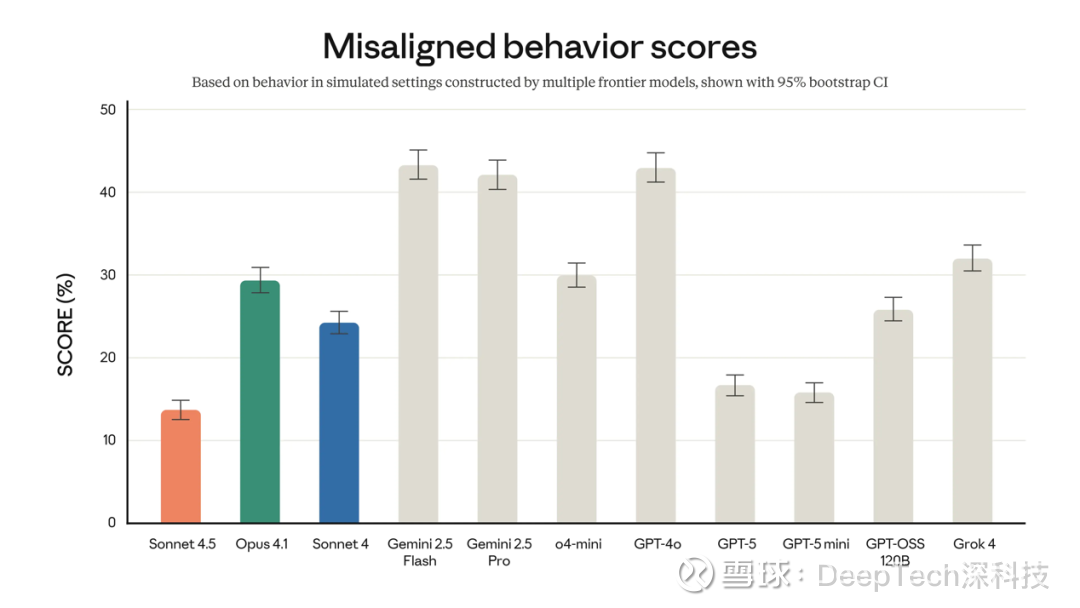 在性能大幅提升的同时,Anthropic 也一如既往地强调了其在 AI 安全和对齐(alignment)方面的努力。官方声称,Sonnet 4.5 是其迄今为止“最对齐的前沿模型”,在减少如谄媚(sycophancy)、欺骗、权力寻求等不良行为方面取得了显著进步。同时,模型在抵御提示注入(prompt injection)等恶意攻击方面的能力也得到了增强。