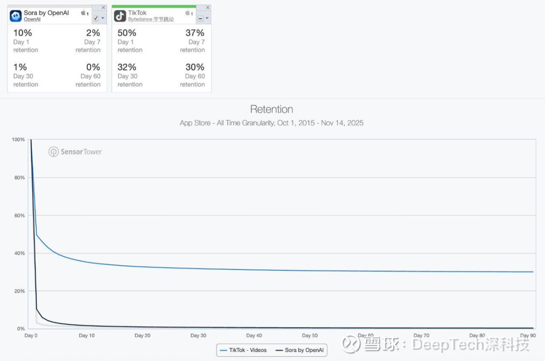 然而事实很快证明,短暂的辉煌并不能掩盖结构性问题。根据近期公布的第三方数据,Sora App 的用户留存率与 TikTok 相比显得相当疲软,其首日留存率只有 10%,30 天的留存率甚至仅有 1%。早期的新鲜感一旦消退,一个纯 AI 内容的信息流显然难以形成持续的用户黏性。