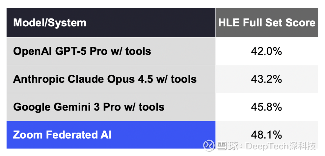 最近,视频会议软件公司 Zoom 发布了一条出人意料的消息:他们宣称在“人类最后的考试”(Humanity s Last Exam,简称 HLE)这个号称当前 AI 领域最具挑战性的基准测试上,取得了 48.1% 的成绩,比此前由 Google Gemini 3 Pro(带工具)保持的 45.8% 高出 2.3 个百分点。