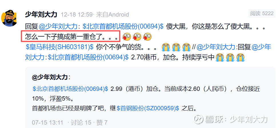 12月16日$北京首都机场股份(00694)$ 最低跌到了2.60港币,鉴于我12月11日刚刚2.70港币小幅加仓,时间和空间拉开得还不太够,我正犹豫踌躇要不要加仓,12月18日突然来了一个放量上涨,最高冲到2.91,收于2.85。上午时分我坐在马桶上的时候,打开持仓列表居然发现,它已经超越$皇马科技(SH603181)$ 成为我的第一重仓,颇为吃惊。![]()