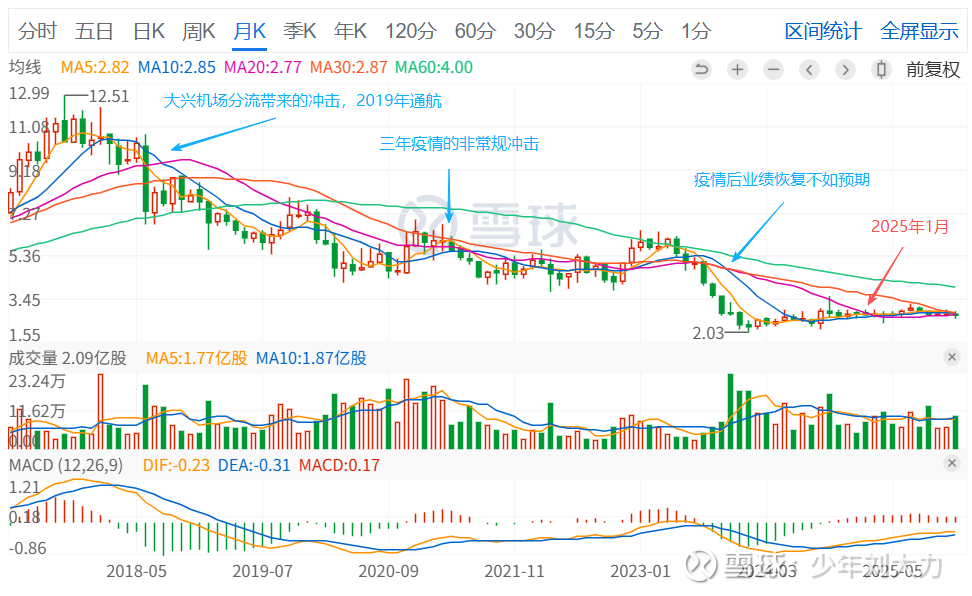 市净率在0.9左右,破净的市值,且从月K线图上看,近几年由于疫情冲击和大兴机场的分流,股价从高点的12.51最低下跌到2.03,跌幅高达84%,堪称脚踝斩,目前2.80-3.00之间的股价,已经回到了几乎是15年前。经过长达7年的下跌,所有的利空已经在股价中得到了充分的反应,向下空间还有没有?不排除有,但应该不多了。