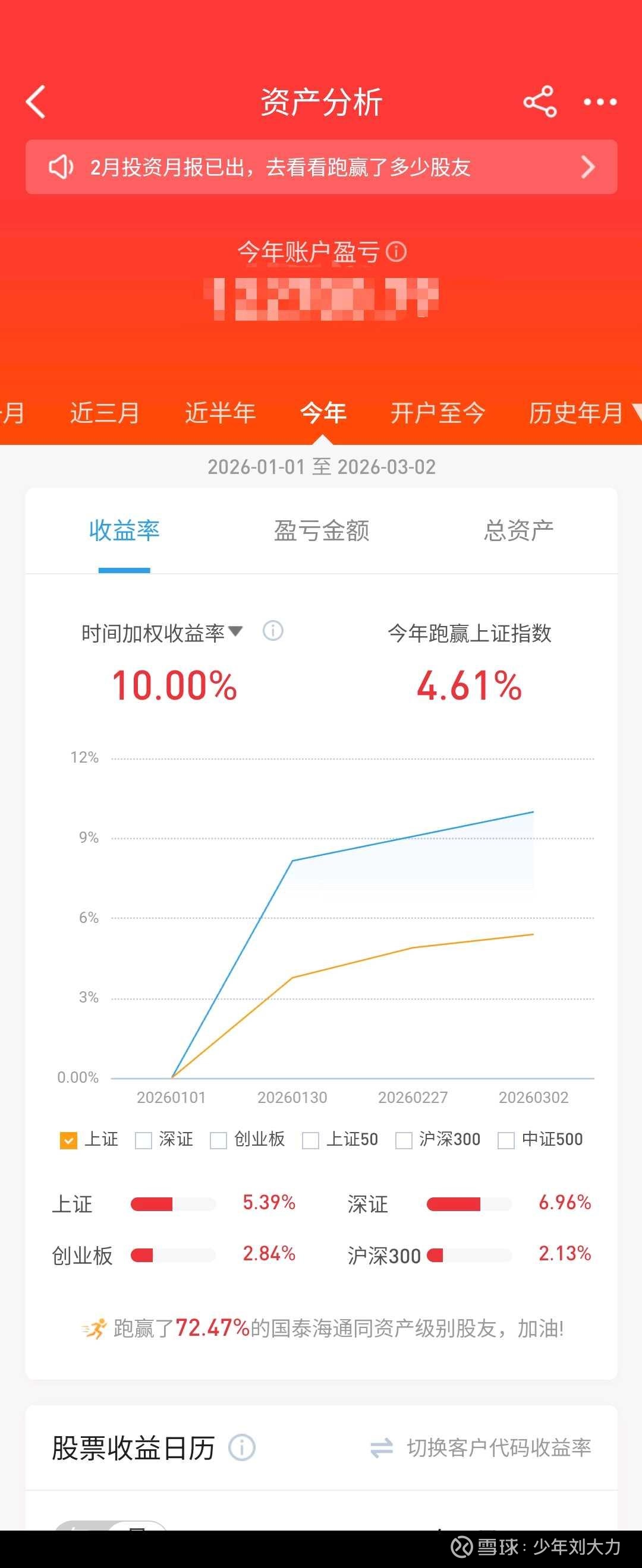 早上看了下,我这券商的收益统计要次日才能看,截止昨天的今年收益率刚好达到两位数,10.00%,精确到小数点后两位,一分不多一分不少。![]()