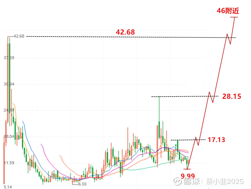 主升浪第一阶段:在17附近,28附近,历史高点附近,这三个位置可能会做一下整理,随后继续向上拓展;主升第一阶段高点,预期46附近,4.5倍左右,随即见顶调整!