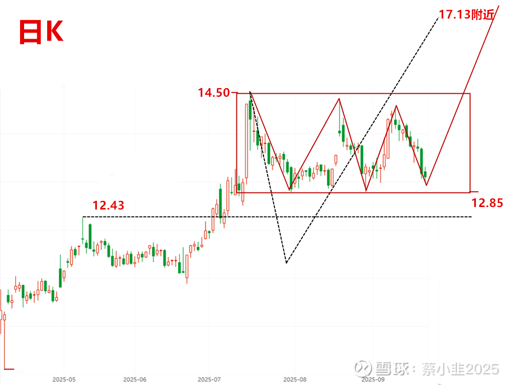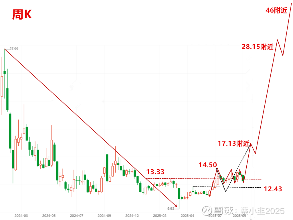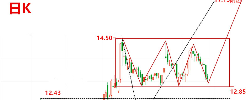 在技术上,完成趋势反转之后,应该回踩到12.43之下,磨个底,主力在此完成最后的筹码搜集,才能继续向上打到17.13附近。图中黑色虚线,就是原本技术上的走势,只是并没有这样干脆利索的去演绎。
